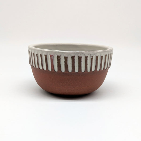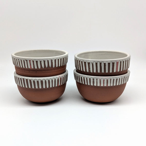 A hint of colour peeks through the white glaze and carved pattern on these bowls.