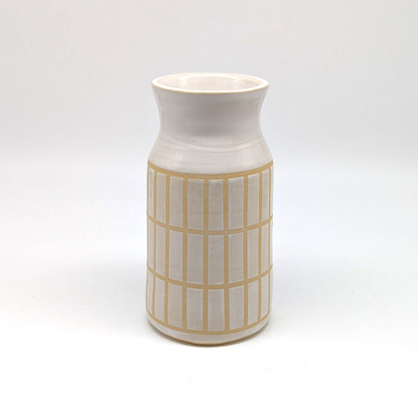 Modern but earthy, these vases contrast bare clay with a precise, crisp glaze grid pattern that is as pleasing to the eye as it is in the hand. The patterns of clay and glaze would compliment an abundant, organic bouquet!